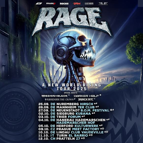 | Na turné s RAGE! 25 Sept. 2025 NÜRNBERG – HIRSCH 26 Sept. 2025 MANNHEIM – 7er Club 02 Okt. 2025 SIEGBURG – KUBANA Live Club 03 Okt. 2025 TRIER – Forum Club Trier 04 Okt. 2025 HANERAU-HADEMARSCHEN – Hademarscher Hof 05 Okt. 2025 HERFORD – Kulturwerk Herford 09 Okt. 2025 PRAG (CZ) 10 Okt. 2025 LINDAU Club Vaudeville Lindau e.V. 11 Okt. 2025 Turin (IT) 12 Okt. 2025 Pratteln (CH) |