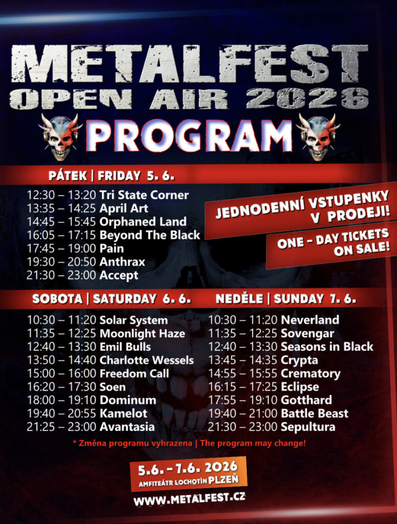 Oblíbený mezinárodní metalový festival METALFEST OPEN AIR, který každoročně začátkem června startuje v PLZNI letní festivalovou sezónu, má venku první várku potvrzených kapel pro svůj už 15. ročník, který se uskuteční v amfiteátru Lochotín od pátku 5. června do neděle 7. června 2026!